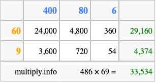 Finally, we add up all the sums we found in step 3 to get our final answer to 486 times 69.