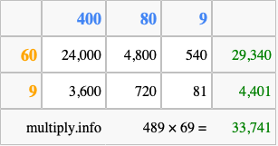 That's all there is to it! As you can see from the box above, the answer to 489 times 69 using the box method is 33,741.