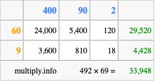 Finally, we add up all the sums we found in step 3 to get our final answer to 492 times 69.