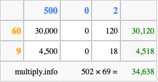 Finally, we add up all the sums we found in step 3 to get our final answer to 502 times 69.