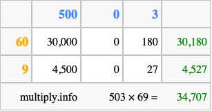 That's all there is to it! As you can see from the box above, the answer to 503 times 69 using the box method is 34,707.