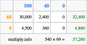 Finally, we add up all the sums we found in step 3 to get our final answer to 540 times 69.
