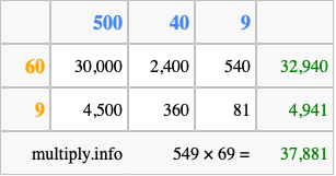 Below is an illustration showing you how to calculate 549 times 69 using the box method, using the instructions above.