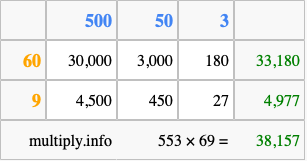 That's all there is to it! As you can see from the box above, the answer to 553 times 69 using the box method is 38,157.