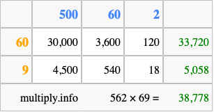 Finally, we add up all the sums we found in step 3 to get our final answer to 562 times 69.