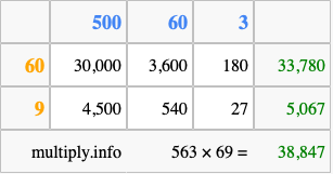 Finally, we add up all the sums we found in step 3 to get our final answer to 563 times 69.