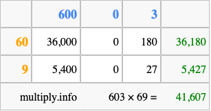 That's all there is to it! As you can see from the box above, the answer to 603 times 69 using the box method is 41,607.