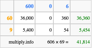 That's all there is to it! As you can see from the box above, the answer to 606 times 69 using the box method is 41,814.