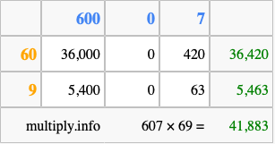 That's all there is to it! As you can see from the box above, the answer to 607 times 69 using the box method is 41,883.