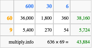 That's all there is to it! As you can see from the box above, the answer to 636 times 69 using the box method is 43,884.