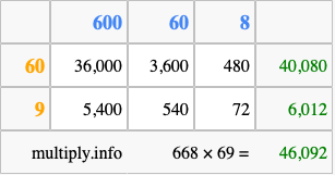 That's all there is to it! As you can see from the box above, the answer to 668 times 69 using the box method is 46,092.