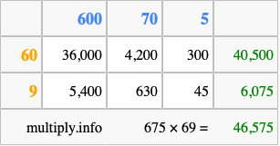 Finally, we add up all the sums we found in step 3 to get our final answer to 675 times 69.