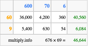 That's all there is to it! As you can see from the box above, the answer to 676 times 69 using the box method is 46,644.