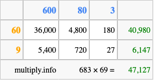 That's all there is to it! As you can see from the box above, the answer to 683 times 69 using the box method is 47,127.