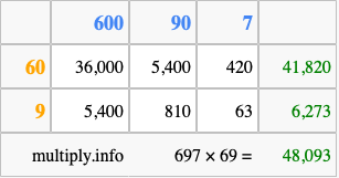 That's all there is to it! As you can see from the box above, the answer to 697 times 69 using the box method is 48,093.