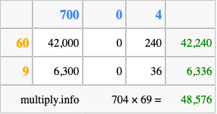 Finally, we add up all the sums we found in step 3 to get our final answer to 704 times 69.