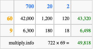 Finally, we add up all the sums we found in step 3 to get our final answer to 722 times 69.