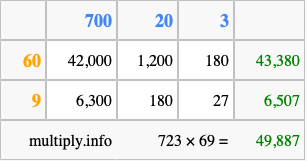 Finally, we add up all the sums we found in step 3 to get our final answer to 723 times 69.