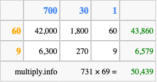 That's all there is to it! As you can see from the box above, the answer to 731 times 69 using the box method is 50,439.