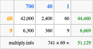 Below is an illustration showing you how to calculate 741 times 69 using the box method, using the instructions above.