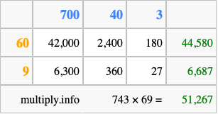 Below is an illustration showing you how to calculate 743 times 69 using the box method, using the instructions above.