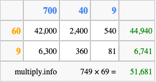 Below is an illustration showing you how to calculate 749 times 69 using the box method, using the instructions above.