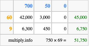 Below is an illustration showing you how to calculate 750 times 69 using the box method, using the instructions above.