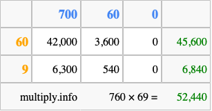 Below is an illustration showing you how to calculate 760 times 69 using the box method, using the instructions above.