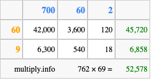 Finally, we add up all the sums we found in step 3 to get our final answer to 762 times 69.