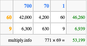 Below is an illustration showing you how to calculate 771 times 69 using the box method, using the instructions above.