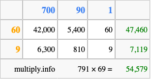 Below is an illustration showing you how to calculate 791 times 69 using the box method, using the instructions above.