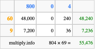 Finally, we add up all the sums we found in step 3 to get our final answer to 804 times 69.