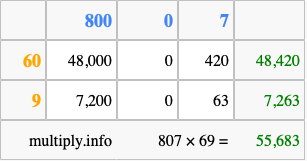 Below is an illustration showing you how to calculate 807 times 69 using the box method, using the instructions above.
