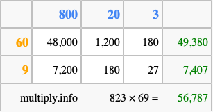 That's all there is to it! As you can see from the box above, the answer to 823 times 69 using the box method is 56,787.