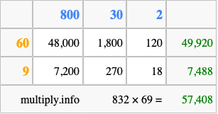 That's all there is to it! As you can see from the box above, the answer to 832 times 69 using the box method is 57,408.