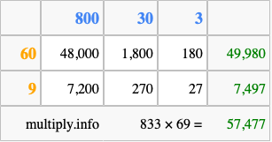 Finally, we add up all the sums we found in step 3 to get our final answer to 833 times 69.