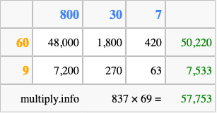 That's all there is to it! As you can see from the box above, the answer to 837 times 69 using the box method is 57,753.