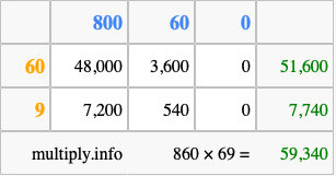 Below is an illustration showing you how to calculate 860 times 69 using the box method, using the instructions above.
