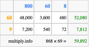 Finally, we add up all the sums we found in step 3 to get our final answer to 868 times 69.