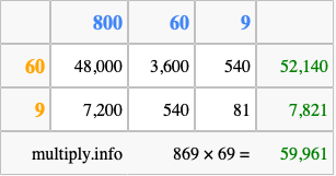 Below is an illustration showing you how to calculate 869 times 69 using the box method, using the instructions above.