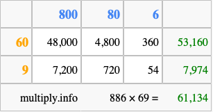 Finally, we add up all the sums we found in step 3 to get our final answer to 886 times 69.