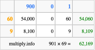 That's all there is to it! As you can see from the box above, the answer to 901 times 69 using the box method is 62,169.