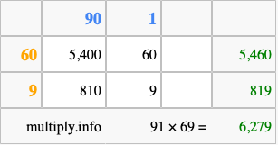 That's all there is to it! As you can see from the box above, the answer to 91 times 69 using the box method is 6,279.