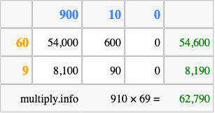 That's all there is to it! As you can see from the box above, the answer to 910 times 69 using the box method is 62,790.