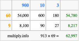 That's all there is to it! As you can see from the box above, the answer to 913 times 69 using the box method is 62,997.