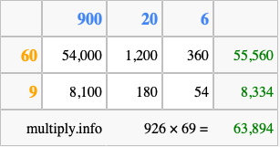 That's all there is to it! As you can see from the box above, the answer to 926 times 69 using the box method is 63,894.