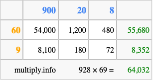 That's all there is to it! As you can see from the box above, the answer to 928 times 69 using the box method is 64,032.