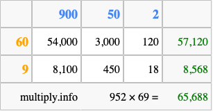 That's all there is to it! As you can see from the box above, the answer to 952 times 69 using the box method is 65,688.