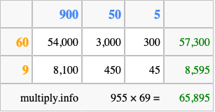 Below is an illustration showing you how to calculate 955 times 69 using the box method, using the instructions above.
