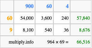 Finally, we add up all the sums we found in step 3 to get our final answer to 964 times 69.